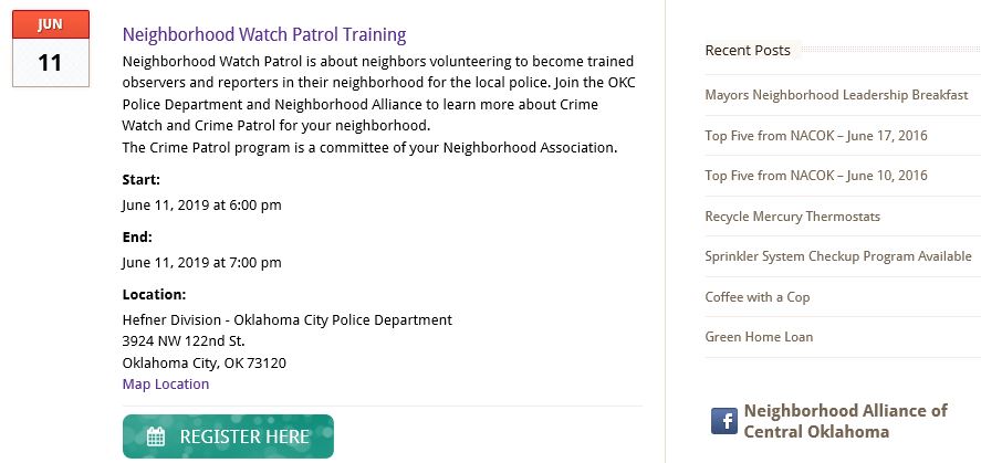 Your patrollers have been patrolling your neighborhood for over a year. The more patrollers the less often a patrollers need to be on the schedule. We have morning, afternoon and evening shifts available. We will work with your schedule. We just need your help to be able to keep patrolling. We are short a few patrollers being out on vacation. There is a class with OKC PD at Hefner Station on June 11, 2019. Contact us at harvesthillssouth@gmail.com and we can get you registered.