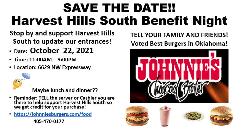 Countdown to Friday, Neighbors Dine Out! Johnnies is sponsoring our Neighborhood Fundraiser. They provide us 20% of all sales generated in support of Harvest Hills South. You must let the order taker know you are there to support us or we do not get credit. Our 20% must be equal or more than $50.00 in order for us to receive a check. Also if we fall below the $50.00 for two (2) months we are out of the program. This is an easy fundraiser. We made $71 in August! We have had one strike against us for the last month. We only had $48.00, so we NEED EVERYONE TO DINE OUT! Let’s try to make $100.00!Tell all your friends!