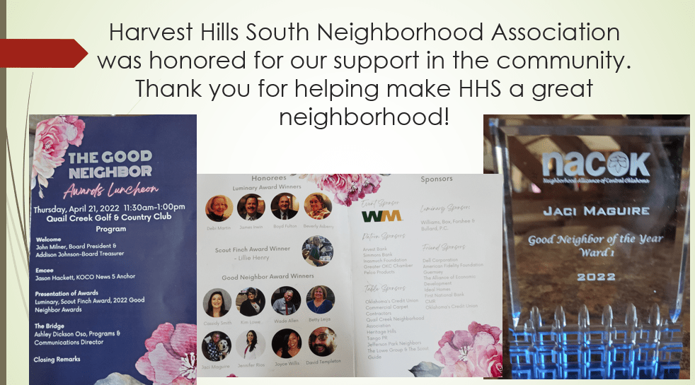 I wanted to share some exciting news! Harvest Hills South Neighborhood Association is being noticed across the city! We were nominated and won “The Good Neighbor of the Year” Award sponsored by Neighborhood Alliance over all neighborhoods in Ward 1 for Oklahoma City!
