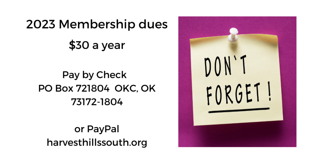 It is also time for 2023 membership dues. Dues will continue at $30.00 annually. You can pay via the blog by credit card, or send a check to the PO box listed below. You may also bring your check to the meeting. All paid members will receive an extra raffle ticket for door prize. We need your support to cover the expenses such as Lawn maintenance which is the largest expense we have, but we also have a website blog, Neighbors Night Out, Post Office Box rental, and electricity bills to name a few. We currently pay the electric bill on NW82, but will soon have Harvest Hills Rd and N McKee as soon OG&E runs the line.